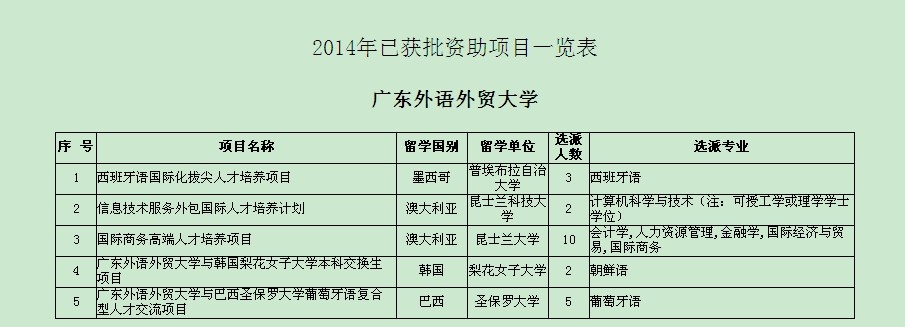 本网讯 国家留学基金委2014年优秀本科生国际交流项目的资助项目清单今已公布,我校共有5个本科生国际交流项目(见下表)获得批准,22名优秀在读本科生可获国家留学基金委资助,项目数和资助人数都比2013年有所突破,2013年为3个项目,9人获资助。