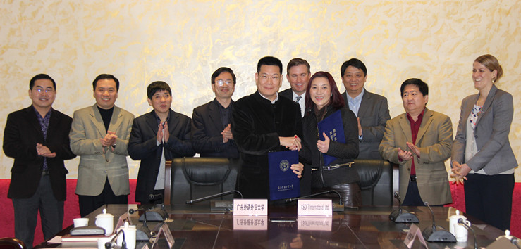 本网讯 1月15日上午,广东外语外贸大学与全球排名前五的语言服务商CSOFT公司的开展深度协同创新洽谈会暨协同创新翻译人才培养实习基地协议签约仪式在北校行政楼会议室成功举行。我校校长仲伟合,副校长何传添、发展规划处处长詹文都、科研处处长陈彦辉、高翻学院院长平洪、党委书记高云坚等出席本次洽谈会,与CSOFT总裁叶雪泥、副总裁Matt Arney、副总裁薛川等一行五人进行了协商洽谈。双方就深度合作发展协同创新中心、人才培养、科学研究、学科建设等方面进行了深入且富有成效的讨论,并随后举行了协同翻译人才培养模式创新协议签约仪式。