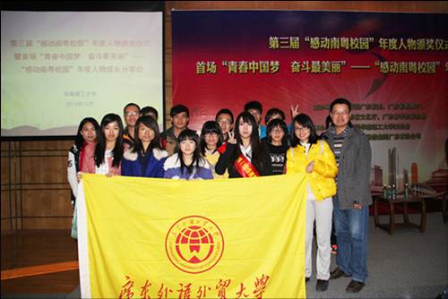 本网讯 12月23日,第三届“感动南粤校园”年度人物颁奖仪式在华南理工大学逸夫科学馆隆重举行。我校经贸学院国贸专业2010级本科生陈安妮以漫画公益获选。除此之外,日前被网友称赞为“跳水哥”的中大男生姚鸿鹄、2012年援塞(塞舌尔)志愿者中唯一的“90后”陆诗婷、右手先天性三级残疾仍自强不息的女孩姚婷等也在入选之列。