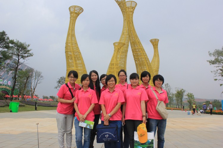 刘燕君(左三)和李雪颖(右四)广西园博会志愿者留念