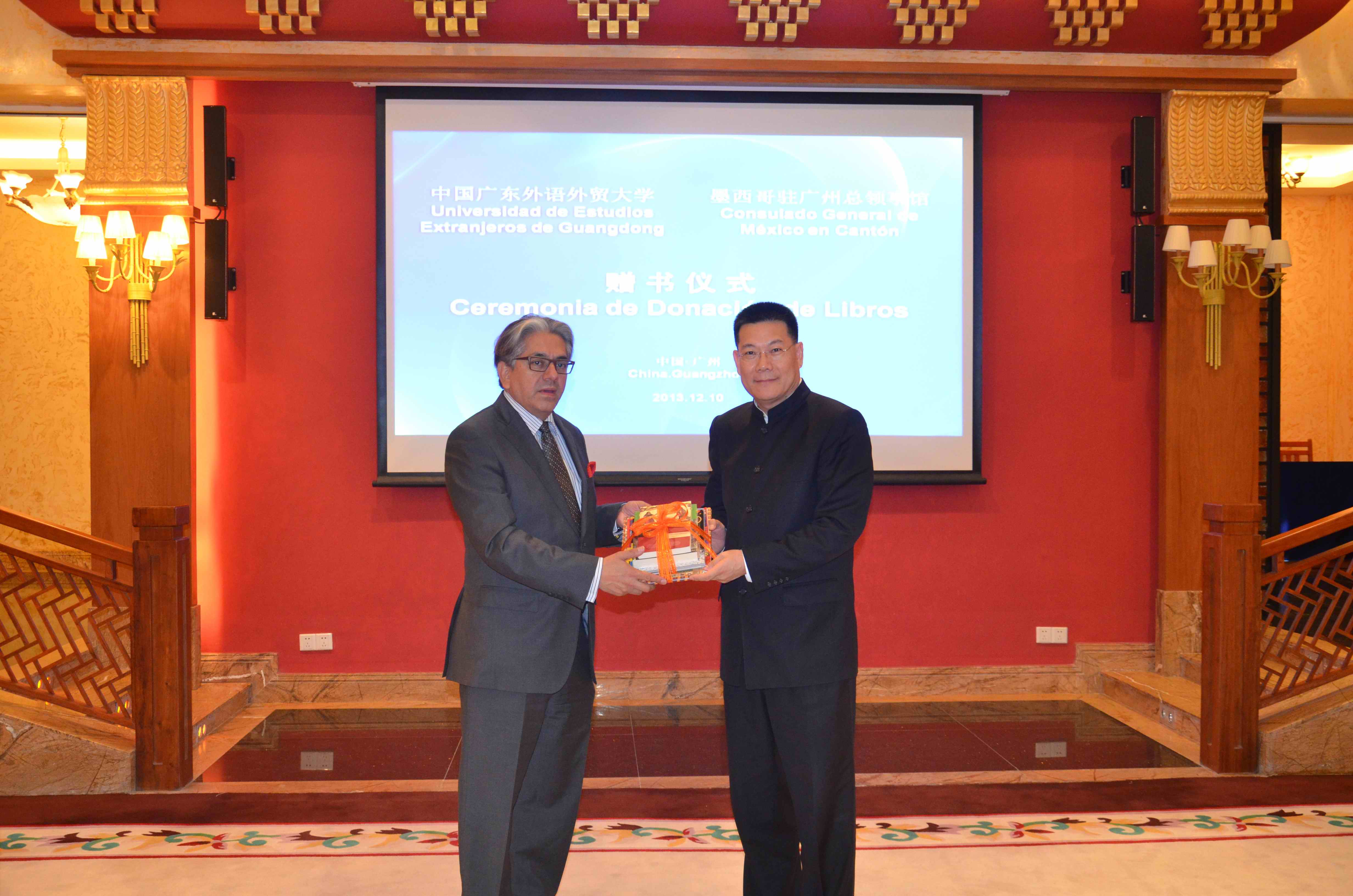 会谈结束后,大卫·纳赫拉代表墨西哥总领事馆向我校赠送西语相关书籍近200册,双方互赠纪念品。