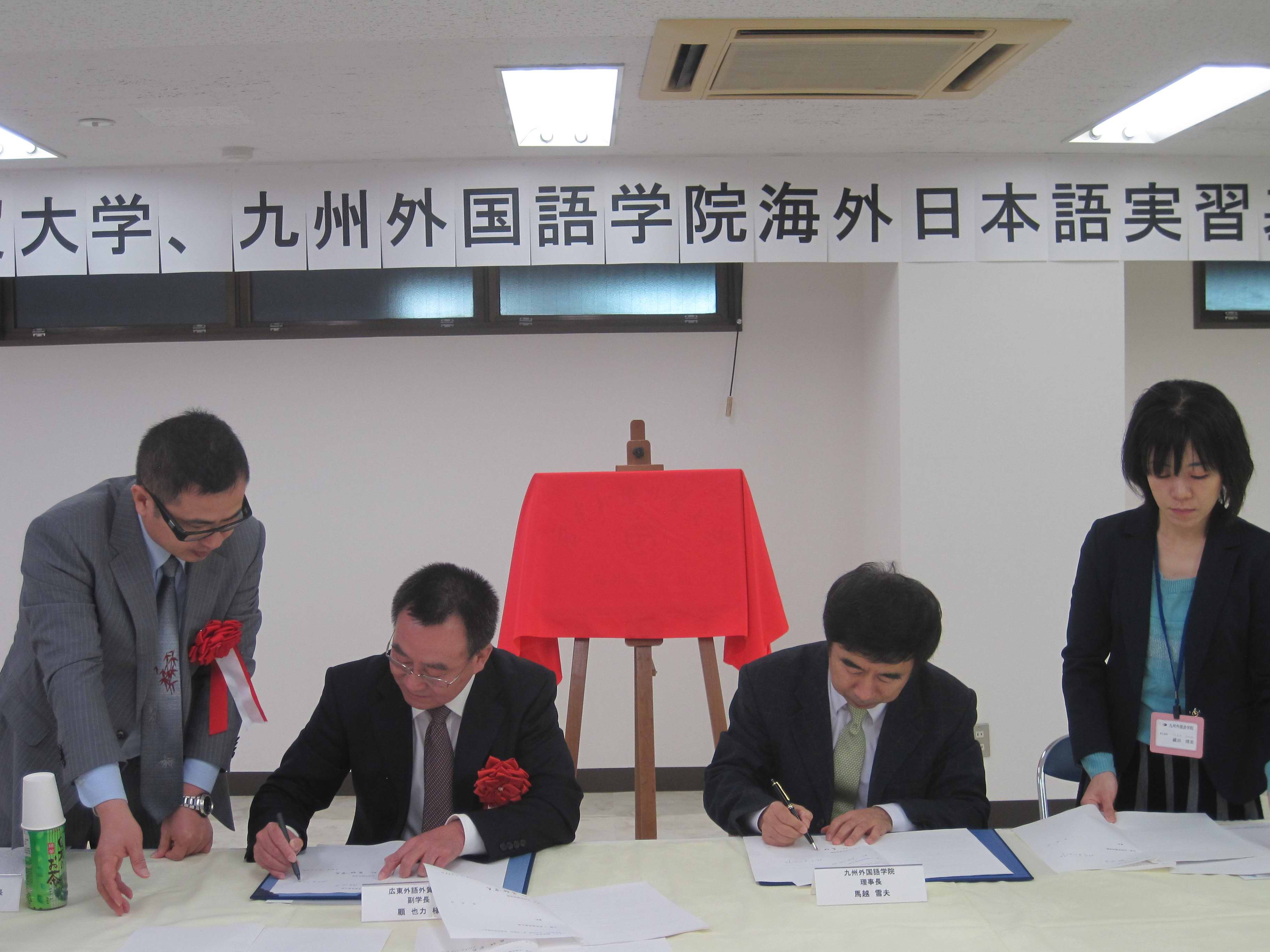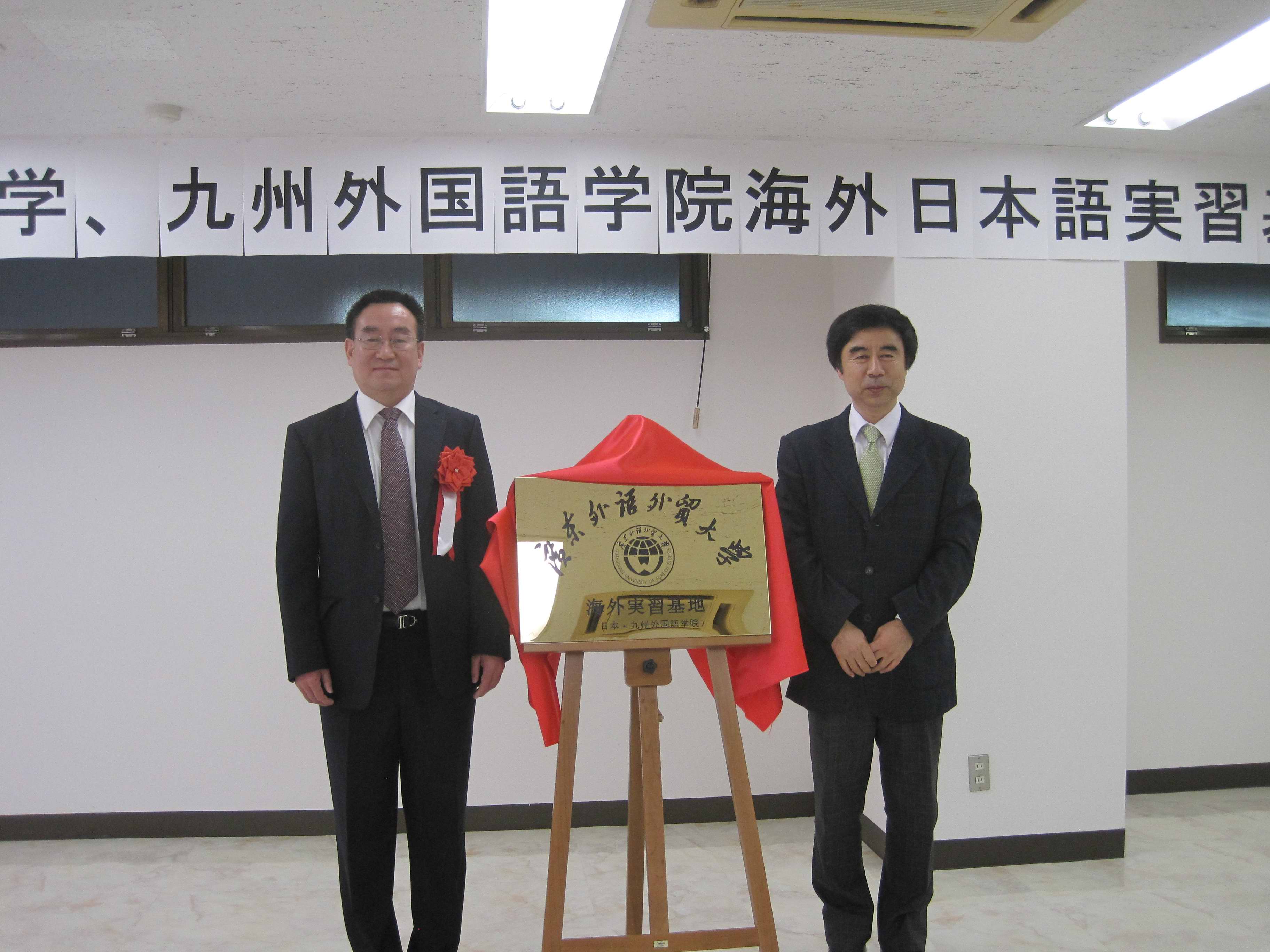 11月27日,顾也力访问了九州外国语学院。九州外国语学院理事长马越雪夫、校长藤原升等会见了顾也力一行。双方领导分别介绍了学校的基本情况和发展战略,一致认为双方的学科设置和专业定位有着很好的结合点,合作空间大。顾也力充分肯定九州外国语学院的国际交流与合作的广度、深度和良好信誉,期待着两校多方面的合作。随后,顾也力与马越雪夫共同签署了《广东外语外贸大学与九州外国语学院海外日本语实习基地协议书》和《广东外语外贸大学与九州外国语学院硕士论文海外写作基地协议书》,并共同为我校九州外国语学院海外实习基地揭牌。
