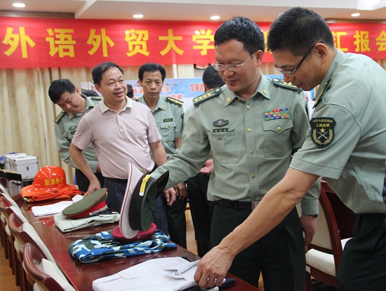 随后,我校武装部部长、军训旅政委钟罗军向督查调研组作了详细的军训工作汇报。配以“新生军训十年回顾”视频,钟罗军以校领导带领新生辅导员提前参加军训,平均每位新生经费投入160元,编写军事理论教材,开展“女子防身术”等实用军训项目等为例,从领导重视、经费保障、教官素质和管理机制保障等方面全面展示了我校在军训各方面工作做出的努力。此外,他就学校在军训实际工作中遇到的问题和困难向上级部门提出了几点建议。