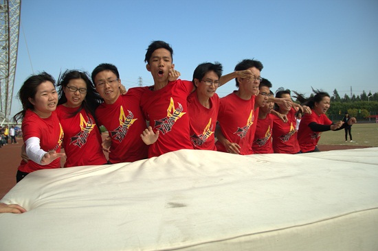 “团结协作”是体育精神一个重要的组成部分。开幕式上的“十人十一足”表演赛上,南北校八支队伍相互扶持,奋力向前奔跑。和谐坚定的步伐,铿锵有力的口号,将这份精神诠释得淋漓尽致。