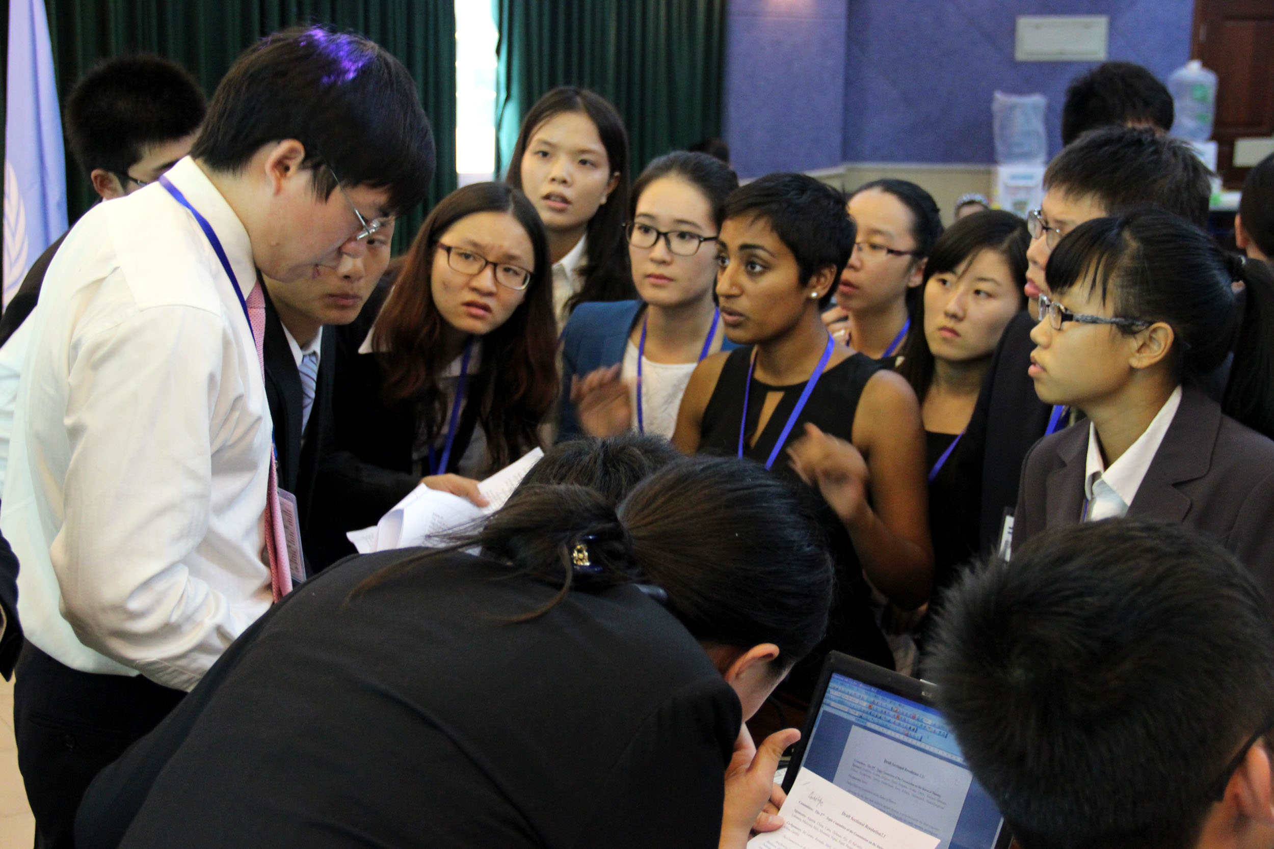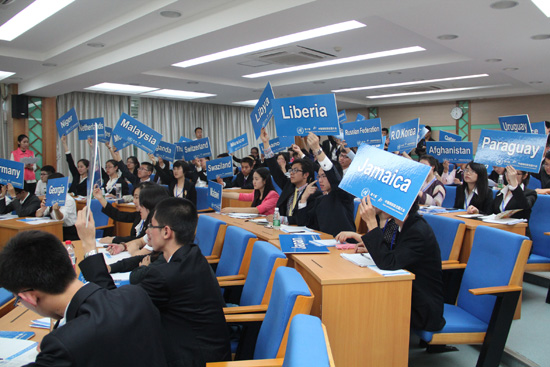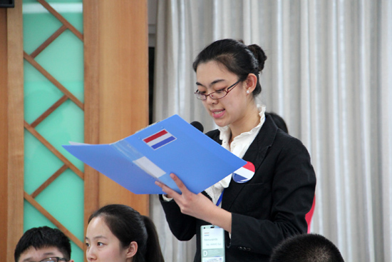 当一位代表按照发言名单的顺序发言完毕后,主席会询问场下有无问题和动议,此时代表可根据自身需要举牌提出问题或动议。在动议中,“每个国家”有60秒时间亮出自己国家的观点。“日本代表”率先提出了“针对妇女与女童的暴力的定义”这一议题。以色列、危地马拉、伊拉克、卡塔尔等国“代表”纷纷上台发表了自己国家的观点。“人类的公平与正义应在制定法律法规中体现”、“该定义的明确需要国际上的认识”,”各国代表“用流利的英文从各国的历史、宗教和传统解释了对此定义的理解。经过磋商谈判后,代表们拟出了两份草案。两份草案的支持国分别上台陈述草案的精神,并回答台下其他代表提出的问题。经过一番精彩的演讲、辩论、磋商,会议的最后,专家评审会对会议给出意见。