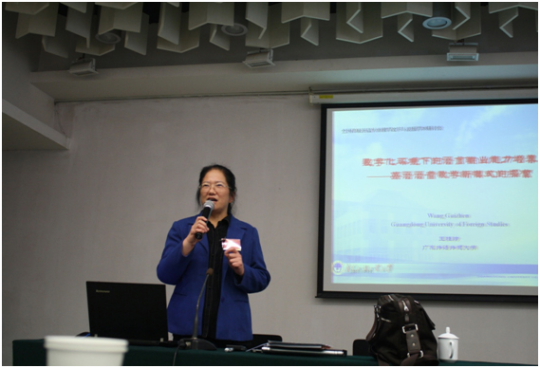 在“以语言输出能力为导向的课程教学模式”专项论坛上,王桂珍教授介绍了我校独具特色的英语语音课程教学模式的实践情况:通过“多媒体辅助课堂教学和网络自主学习”相结合的教学模式,促进和增强学生的英语语音学习。