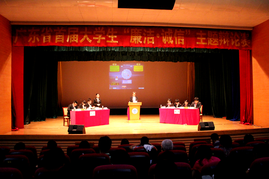 本网讯 10月10日下午,广东省首届省大学生“廉洁.诚信”辩论赛初赛A3赛区比赛在我校北校区第六教学楼报告厅举行。“唇枪舌剑论纵横,能言善辩竞八方。”来自广州体育学院、南方医科大学、广东金融学院及我校的四支代表队伍以思论道、以辩会友,角逐晋级下一轮比赛的两个席位。
