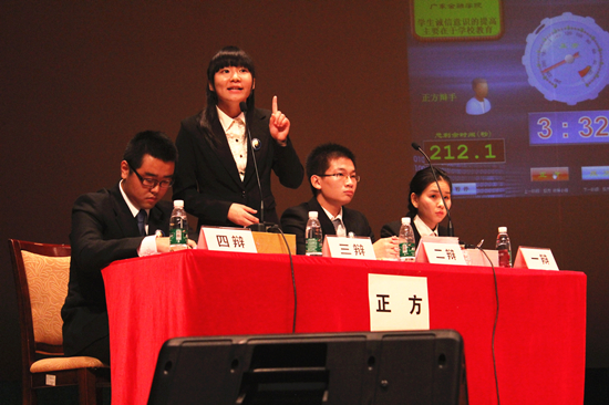 第二轮辩题为学生诚信意识的提高主要在于学校教育还是自我修身。广东金融学院为正方,我校为反方。