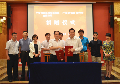 捐赠仪式现场仲伟合对恒润华创给我校教育事业发展的捐赠表示感谢。仲伟合表示,设立“校长基金”的目的是通过大学校级领导的影响力,为学校教育事业发展吸纳社会各方资助。该基金的全部款项均用于奖励和资助在校师生。仲伟合特别提出,正是因为赖淦锋先生秉承高度的社会责任感,怀着一颗热心公益的慈善之心,加入到支持广外建设发展的队伍,才促成了今日的善举。他希望与恒润华创加强校企之间各领域的合作,实现共赢,并祝愿恒润华创公司越办越辉煌,事业蒸蒸日上。