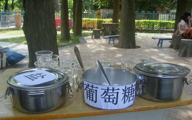 为了保障学生少出问题,测出好成绩,学校分别在检录处和医疗点配备了桶装水、葡萄糖、盐。在检录完一组后,都有专人负责带准备活动,让每位测试者提前进行身体机能的适应,减少身体不适,以提高运动成绩。
