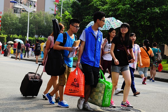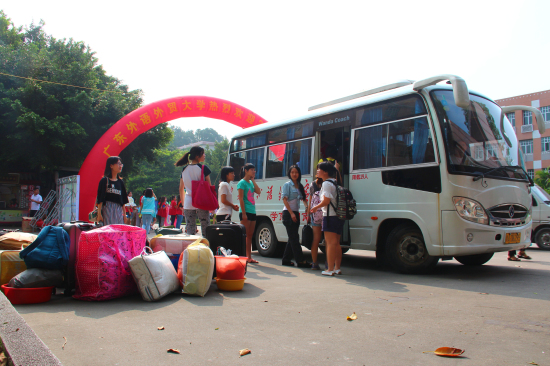 本网讯 9月8日,广外校园一扫往日的寂静,校道两旁挂着各个学院各出心裁的迎新标语。早上七点左右,新生报到处就有倚在行李上等候的学生和家长了。今天,五千余名广外2013级新生踏进了他们理想的“象牙塔”,开始了崭新的大学生活。
