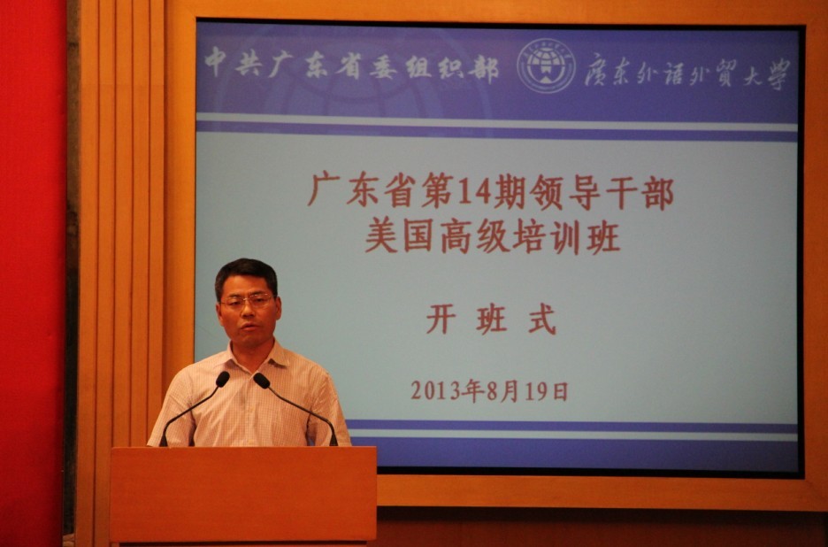 本网讯 8月19日,由广东省委组织部主办的“广东省第14期领导干部美国斯坦福大学高级培训班”开班式在我校北校区举行。省委组织部副部长张辉、省政府外事办公室副主任苏才芳、省财经厅纪检组长、党组成员邓桂明,我校党委书记隋广军、副书记卢景辉以及35位培训班学员出席了仪式。仪式由省委组织部部务会成员、副厅级组织员陈文明主持。