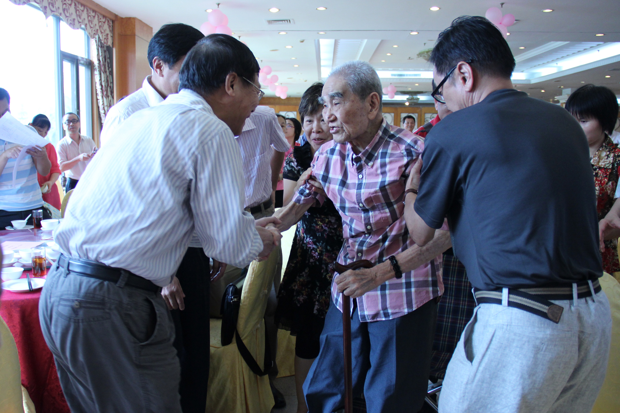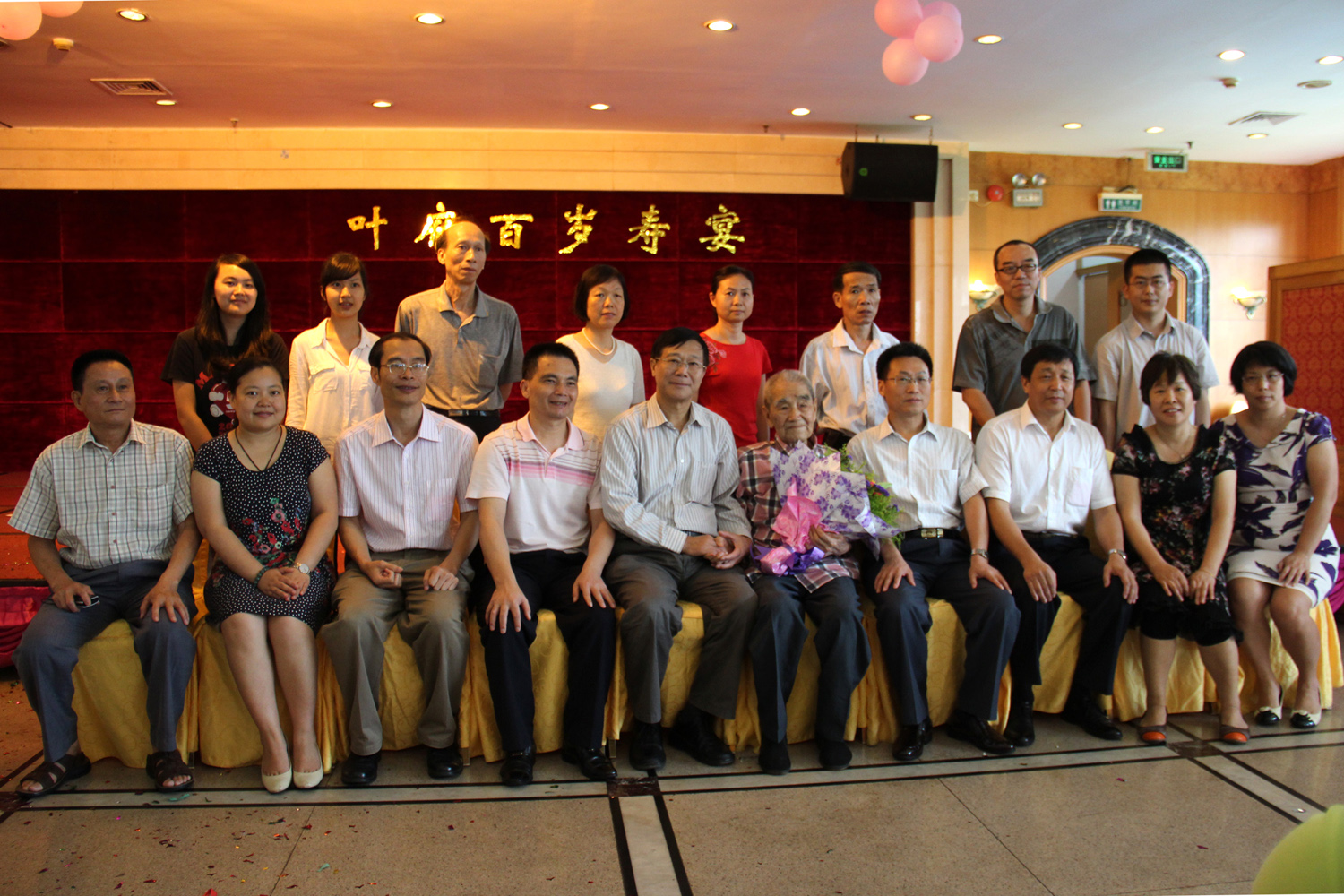 本网讯 6月15日,我校老教授叶自任的百岁寿宴在顺德碧桂园豪苑会所举行。叶自任曾于1972年5月始到原广州外国语学院从事教学、教研和管理工作,并于1985年从原广州对外贸易学院离休。我校党委副书记陈建平,离退处处长王新贵、副处长潘运利、董小平,教育学院院长董金伟、党委书记林绍雄,党委宣传部副部长陈红霞等前去贺寿,送去祝福。