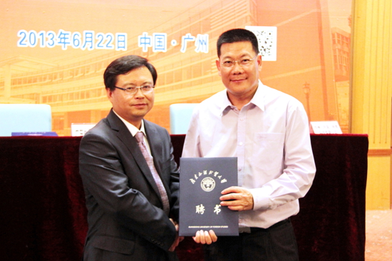 在学术讲座前,仲伟合为何恩培颁发客座教授聘书。随后,何恩培在讲座上畅谈了当前翻译行业的现状与发展。