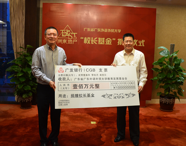 本网讯 5月30日下午,在广州尚东地产集团有限公司总部,集团董事长、广东国际华商会会长郭泽伟先生向我校教育发展基金会“校长基金”项目捐赠人民币一百万元整。我校校长仲伟合代表学校接受了捐赠。