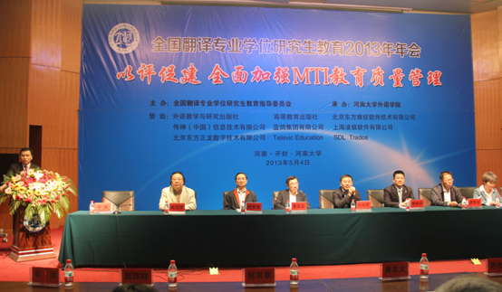 本网讯 5月3至4日,全国翻译专业学位研究生教育2013年年会在河南开封召开,全国159所MTI培养单位近300名代表出席了会议。我校校长仲伟合作为全国翻译专业学位研究生教育指导委员会副主任委员参加了该会议并在会上发言。教指委秘书长、我校翻译学院院长平洪,副院长赵军峰,教授穆雷等也参加了本次年会。