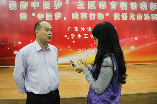 活动结束后,校党委副书记卢景辉接受了本网记者的采访。他高度评价了此次活动,他认为这激发了大学生对“中国梦”和“个人梦”的深度思考。他谈到,演讲比赛中选手们结合实际诠释“中国梦”主题,所表现出的务实精神让他“感动”。他还说道,放眼国内,广外学子是“优秀青年中的佼佼者”,而学校也将为学生提供更多施展才华与抱负的平台,乘着“中国梦”的步伐,与万千学子共筑“广外梦”。