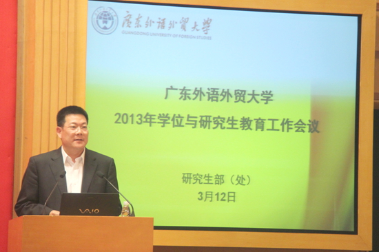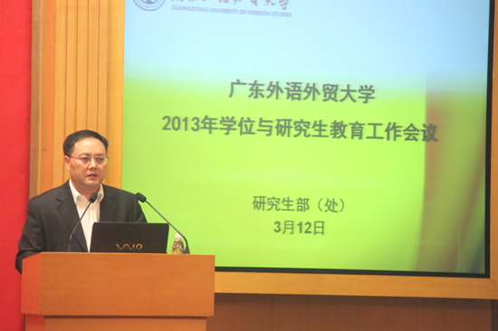 他强调:“研究生教育是强校之路,要打造卓有特色的研究生教育,为建设国际化特色鲜明的高水平大学提供支撑”。他高度肯定了我校学位与研究生教育工作在2012年取得的斐然成绩,一是大力推进学位点建设,学科整体实力不断增强,我校新增4个二级学科博士点,二级学科博士点增加到11个;二是注重内涵发展,研究生教育核心竞争力稳步提升,我校现有5篇硕士学位论文成功入选省级优秀硕士论文;三是深化对外合作与交流,研究生教育国际化取得显著进步,我校出国攻读博士学位及联合培养的研究生已占在校研究生总数的5%左右;四是突出特色导向,研究生课程建设取得新进展。广东外语外贸大学研究生“名师名课名作”系列丛书将陆续出版。