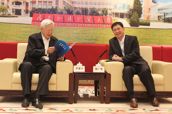 罗豪才谈到,“我们应该积极主动地参与全球治理。过去,我们对全球治理比较陌生,参与全球治理积极性不高。当今,中国在世界舞台上的声音更大了,话语权更多了,应该在全球治理中有所作为”。他表示,广外应发挥外语和外贸学科的优势参与全球治理,积极“走出去”。对于法学发展,罗豪才认为我校可以积极引进各地各国人才。回顾2010年他自己为我校区域一体化法治研究中心揭牌,罗豪才表示,从区域一体化这一特定的视角,聚结力量、融合多学科资源,其发展前景是不可估量的。