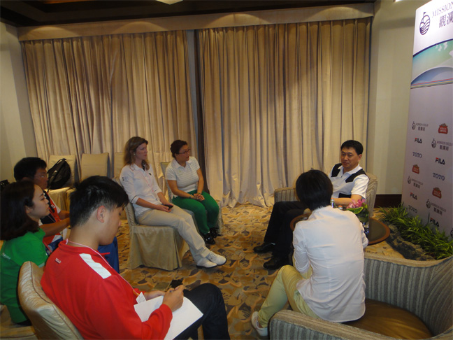 9日中午,校党委书记隋广军在体育部主任林少娜、第一教学部主任王鲁江的陪同下赴海口观看比赛并慰问我校参赛队员,赛会期间隋广军接受观澜湖总裁、欧巡赛首席发言人、韩国大师网等媒体人士的采访。