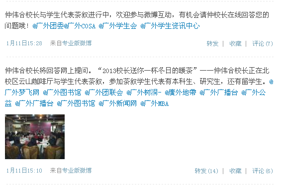 为弥补众多不能亲临现场的同学们的遗憾,宣传部在其官方微博现场发布消息,在线征集同学们的意见和诉求。茶叙会上,宣传部工作人员选取了有代表性的部门问题汇报校长,仲伟合现场给予了解释和回应。