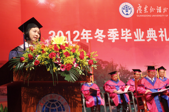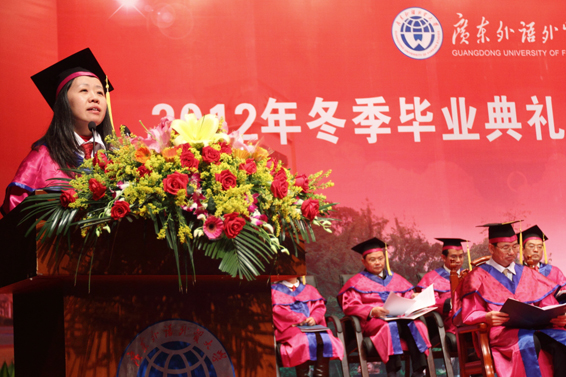 她对母校为广大学子提供了优美的校园环境、丰富的馆藏图书、先进的实验设备和优良的人文环境表示感激。她表示,同学们会牢记老师们的殷切期望,牢记“明德尚行 学贯中西”的校训,带着广外赋予的国际化、专业性开启全新的的人生旅程。