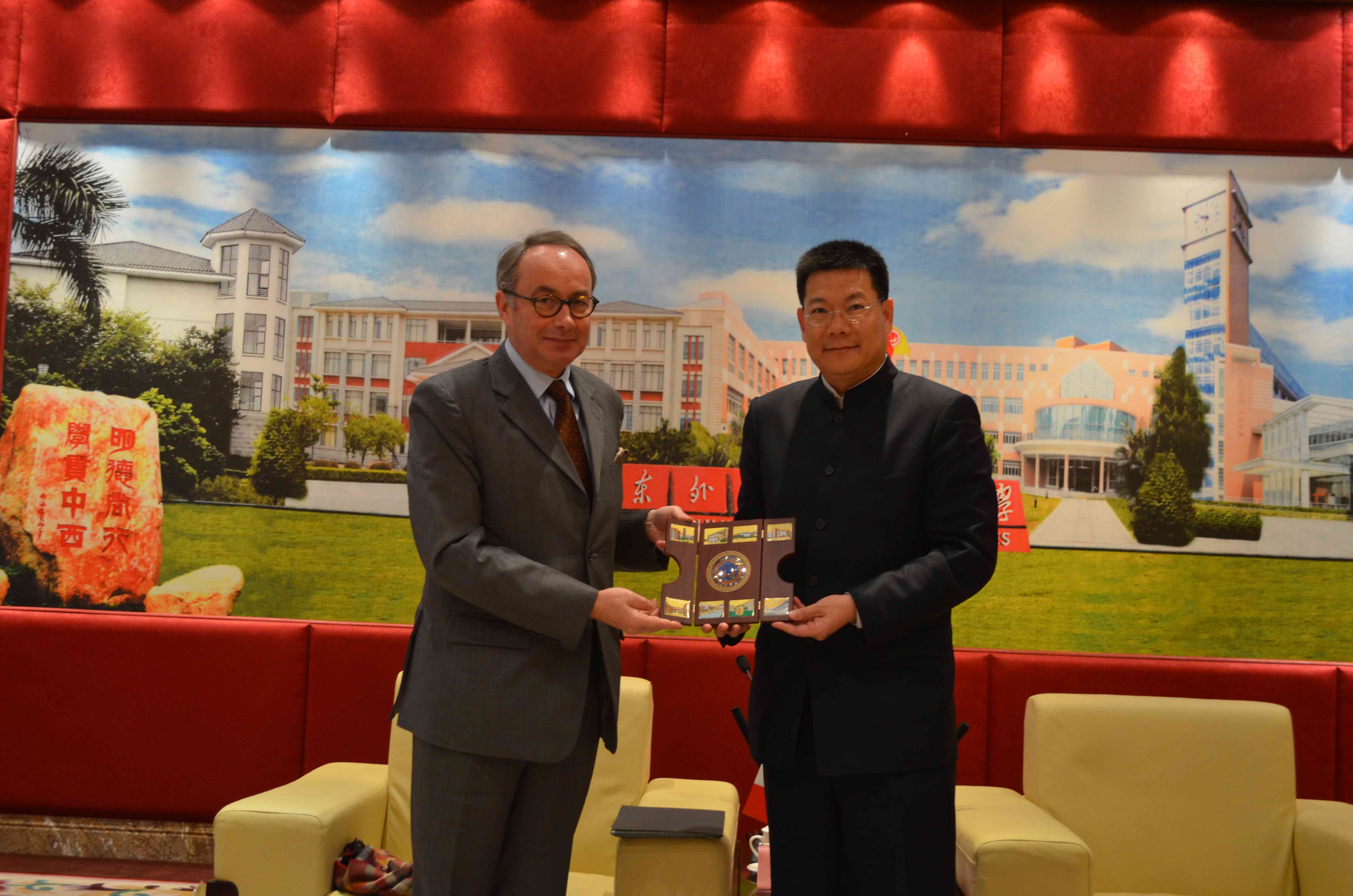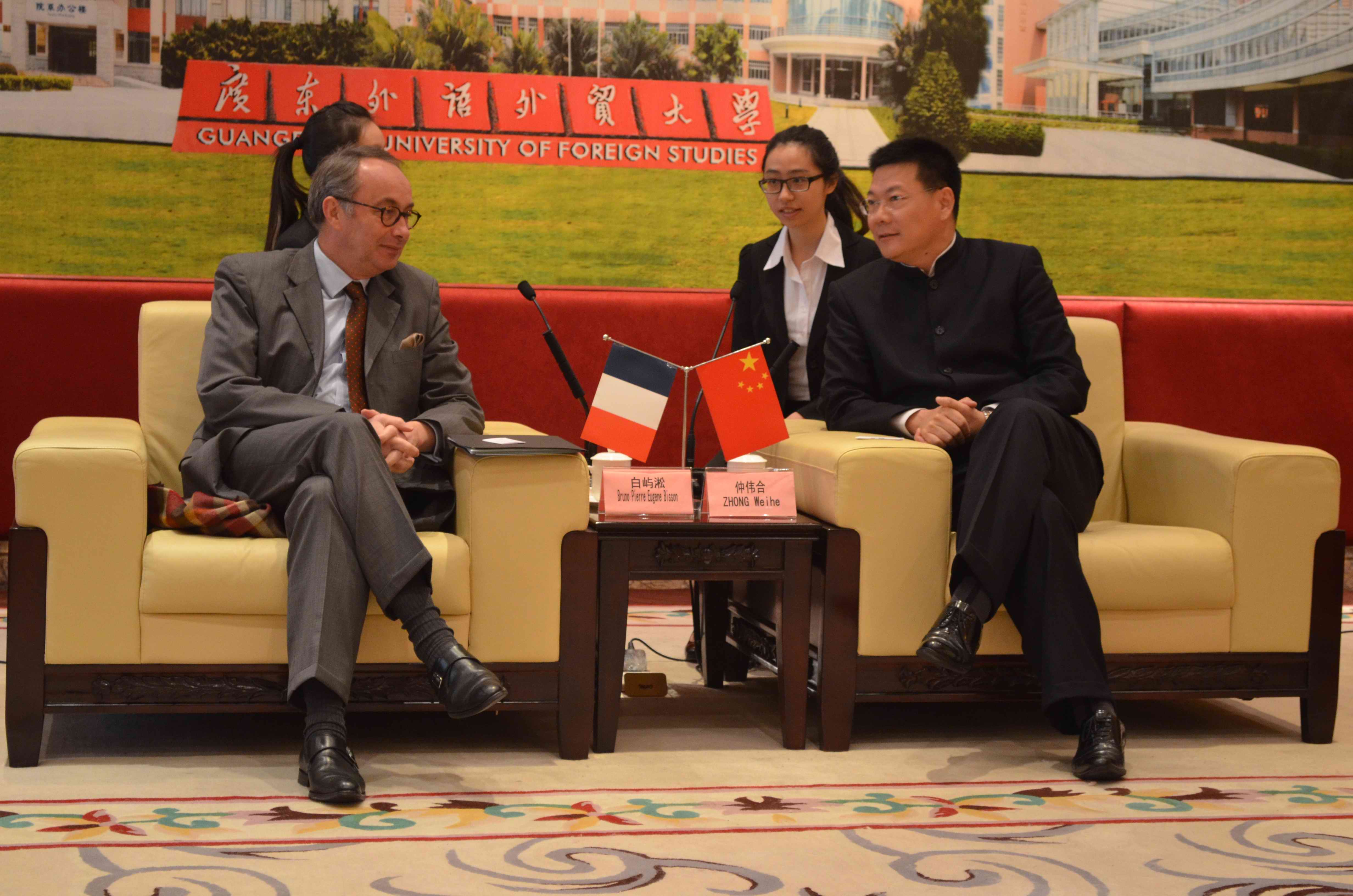 仲伟合首先欢迎白屿淞的到来,并回顾了法国总领事馆与我校的长期紧密合作,感谢对白总领事以及总领事馆对我校的大力支持。我校法语专业在华南地区首屈一指,为经济发展以及对外交流培养了大批优秀人才。仲校长尤其谈到了法国广州总领事馆对“欧罗巴”文化节的大力支持,借助这一传播欧洲文化的平台,西语学子充分展示了自己的才华。仲伟合提到,总领事馆对广外的发展非常重视,先后三位教授被法国政府授予骑士勋章。在此,他特别强调了郑立华教授带领的团队对中法企业的跨文化研究做出了巨大贡献。