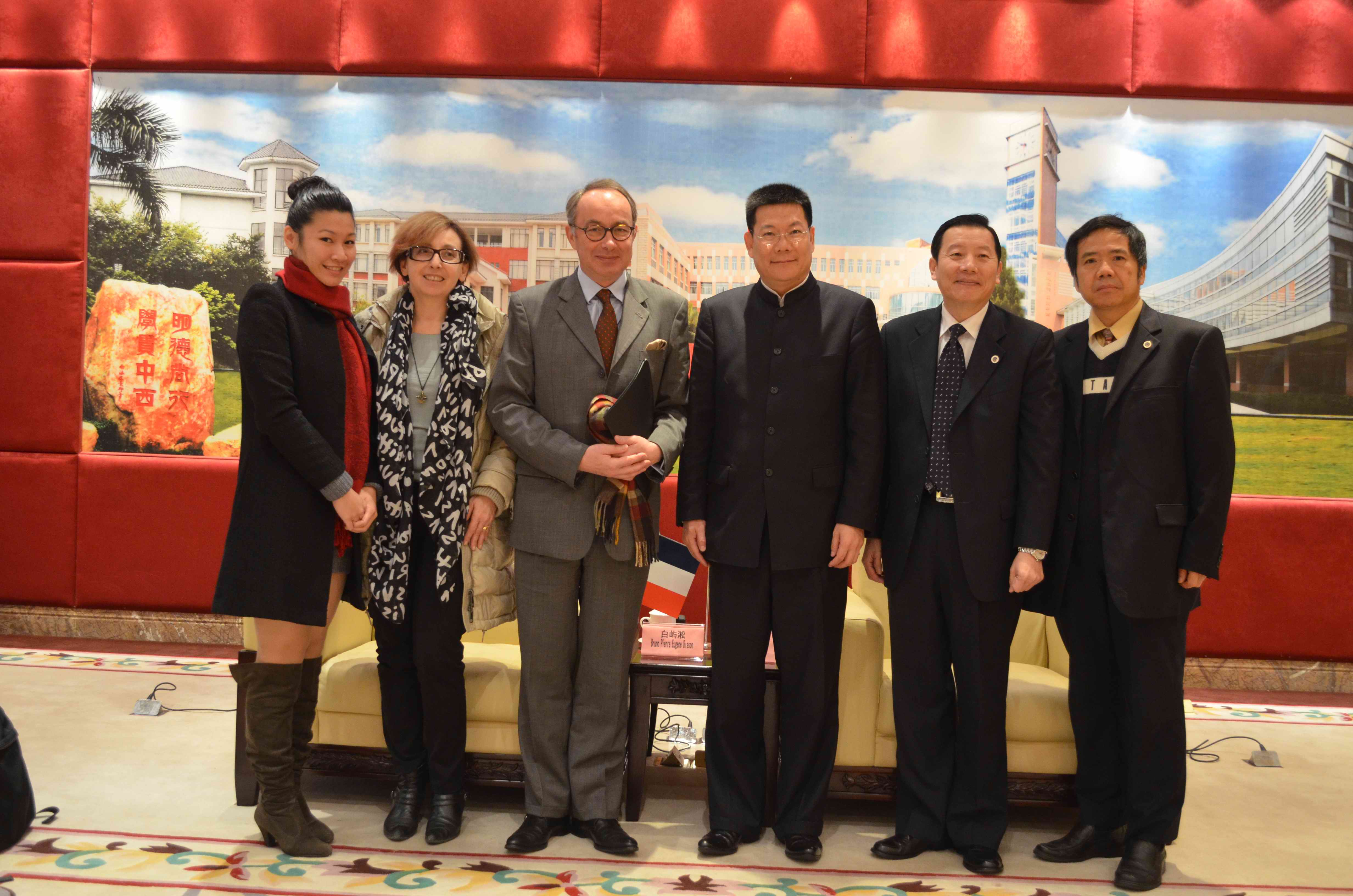 本网讯 12月19日上午 ,法国驻广州总领事白屿淞(Bruno Bisson) 在领事馆文化专员刘佩华(Pascale Vacher)等人的陪同下来访我校。我校校长仲伟合在行政楼贵宾厅会见来宾。陪同会见的有:副校长方凡泉、国际合作与交流处处长焦方太、西方语言文化学院院长郑立华、院长助理杨晓敏等。