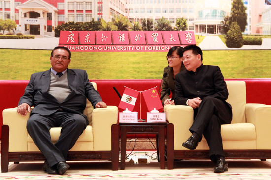 仲伟合首先对加斯帕·德卡皮奥·罗德里格兹的来访表示欢迎,并代表曾任圣玛利亚天主教大学孔子学院中方院长一职的李砾老师感谢秘鲁友人,现场气氛非常融洽。仲伟合谈到,广外早在1965年起便开设西班牙语课程,现有近1800名来自90多个国家和地区的留学生。他希望双方能有进一步了解,以便在日后进行深度合作。