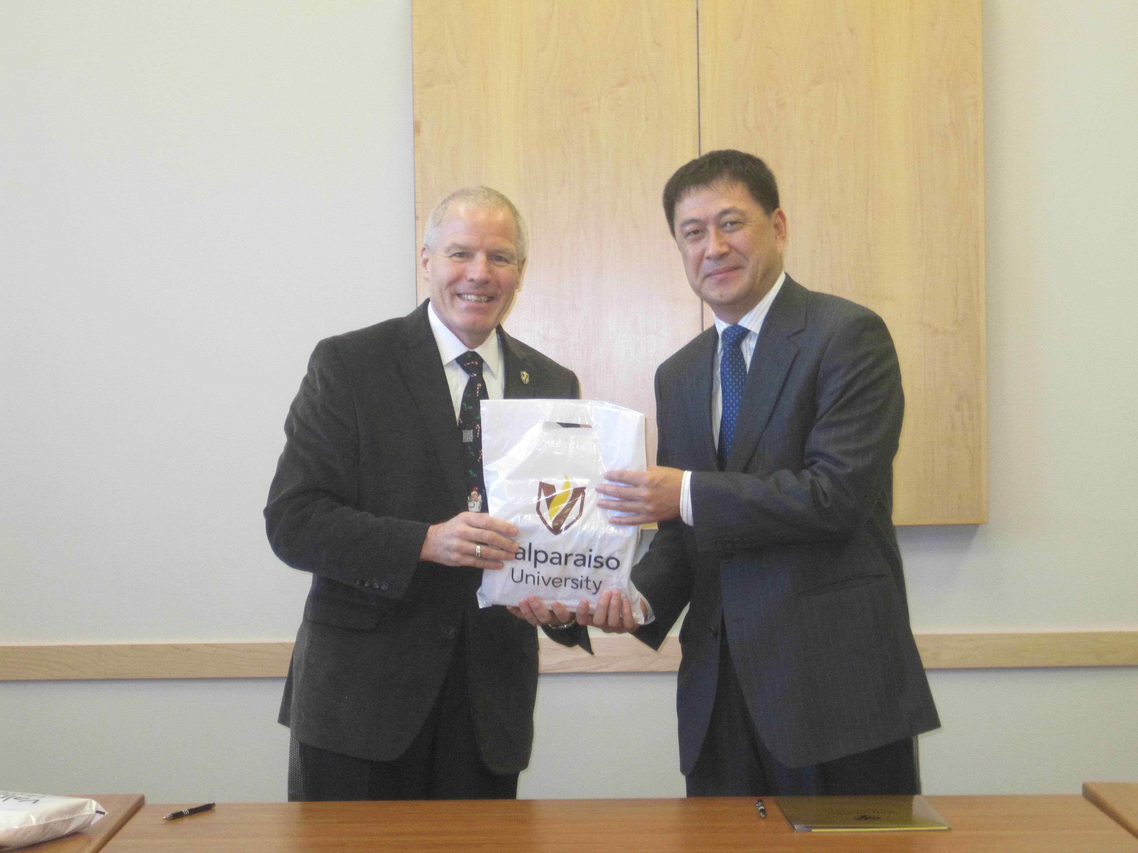 12日,隋广军访问了瓦尔帕莱索大学。该校校长Mark Heckler、教务长Mark Schwehn、国际处处长Jaishankar Raman、商学院院长Jim Brodzinski等参加了会见。这是我校领导首次访问该校。隋广军介绍了我校的基本情况和教育国际化战略,希望我校与该校在广泛的领域进行合作,推动教师、学生的双向流动和科学研究的合作。双方还就具体的合作项目进行了商议。随后,隋广军与Mark Heckler共同签署了两校的校际合作协议。