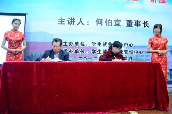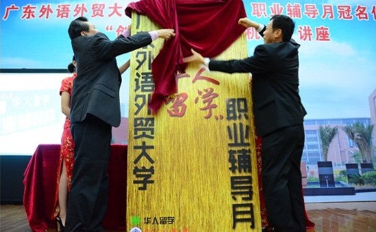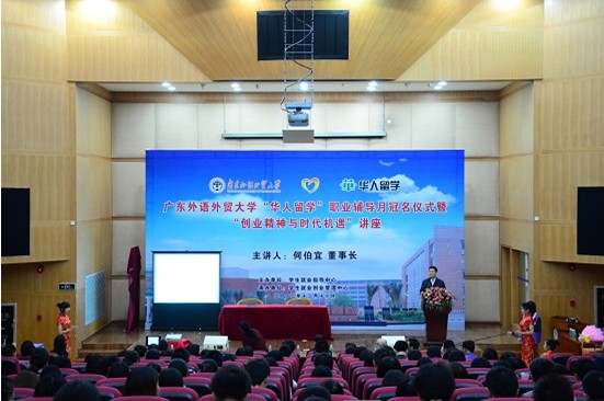 本网讯 12月13日晚,我校“华人留学”职业辅导月冠名仪式暨“创业精神与时代机遇”讲座在南校区图书馆报告厅召开。 出席嘉宾有广州市华人留学事务所有限公司董事长何伯宜,副董事长何斌,总经理助理李艳,广东阳光留学服务办公室主任蔡卫珍等。我校副校长许国彬,就业指导中心主任赵烨、副主任徐昶斌和黄石胜等出席本次活动。