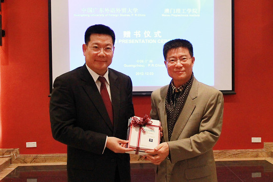 据悉,在仲伟合访问澳门时,澳门理工学院学院向我校捐赠了一大批原版葡语书籍。为表感谢,在此次会见上,仲伟合向澳门理工学院赠送我校高级翻译学院教师著作。对此,李向玉笑称:“我们通过赠书,互通有无,资源共享。”,并再次赠送我校带有澳门理工学院校训的纪念品。