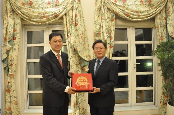 最后,隋广军对杨昌洙的热情款待表示感谢,并向总领事赠送纪念品。