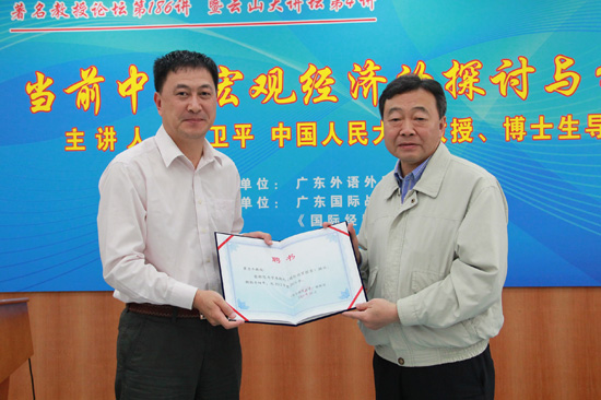 校党委书记隋广军、副校长何传添等出席了论坛。会上,隋广军向黄卫平颁发了我校《国际经贸探索》杂志顾问的聘书。