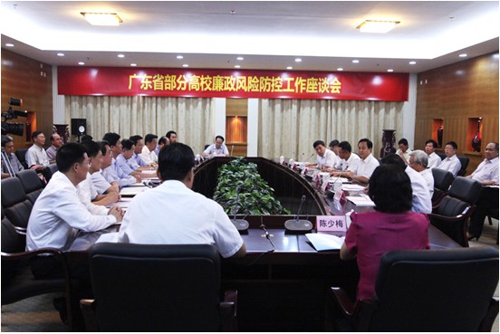 10月24日,广东省委常委、省纪委书记黄先耀莅临我校,出席在我校南校区行政楼第三会议室召开的高校反腐倡廉及廉政风险防控工作座谈会。黄先耀强调,高校要培育好校园廉洁文化引领好社会风气,严格把好招生录取、基本建设、物资采购、财务管理、科研经费、校办企业、学术诚信七个“监督关口”。