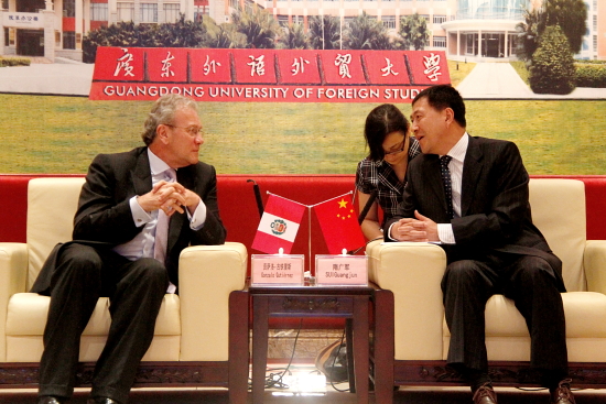 隋广军首先代表学校对贡萨洛的来访表示欢迎。他说道,我校已与秘鲁两所大学建立良好的高校合作关系,与秘鲁圣玛利亚天主教大学合办孔子学院,学生教师交流项目取得良好成效。他介绍道,我校自1965年建校起就设立西班牙语专业。在广东省经济贸易活跃、与南美贸易关系受重视的背景下,企业、政府机构对西语系毕业生的需求和青睐使我校西班牙语毕业生就业率高达100%。他还表示,希望今后我校西班牙语系与秘鲁的合作关系能进一步推进,双方继续就感兴趣的问题共同研究。