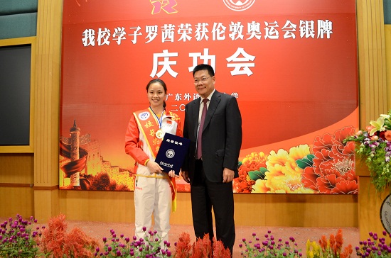 仲伟合在庆功会上致辞。他向在伦敦奥运会取得骄人成绩,为国家、广东省和广外争得荣誉的罗茜表示祝贺,并向一直以来支持罗茜的学校师生表示感谢。他谈到,罗茜在赛场上的奋勇拼搏诠释了“更高、更快、更强”的奥林匹克精神,也是伦敦奥运会口号“inspire a generation(激励一代人)”的良好展现。他希望罗茜的精神和行动能够进一步激励我校师生,并内化为广外人的精神。他最后希望罗茜能够再接再厉,不断超越自我,并预祝罗茜的人生更加灿烂。