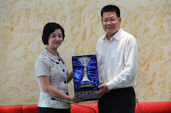 仲伟合向来宾介绍了我校近期的发展情况,对李渝凤校友多年来给予母校的关心表示感谢。仲伟合说道:“在未来5年内,我校力争增加5个语种,包括老挝语等东盟国家语言。希望双方能携手共进,一起开拓新道路。”他还表示,广外将不遗余力地帮助海南外国语职业学院发展,希望该校早日成为国家外语人才培养基地。