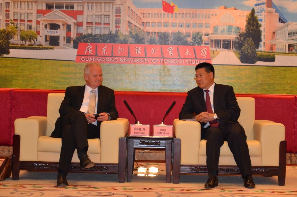 仲伟合对首次到访广外的格鲁瓦尔德一行以及老朋友谢宾和维特科夫斯基等人的到来表示欢迎。他简要的向来宾介绍了广外的概况和国际化发展战略等。与许多国外大学一样,我校一直重视教育国际化。迄今为止,我校已经与200余所国境外高校和机构建立了合作,而与什切青大学和维施马大学的交换生合作为我校学生提供了更多机会,让他们能在短时间内感受波兰和德国两种不同的文化。仲伟合对两所对我校交换生的照顾表示感谢,特别是维特科夫斯基为广外和什切青大学的合作做出的努力。