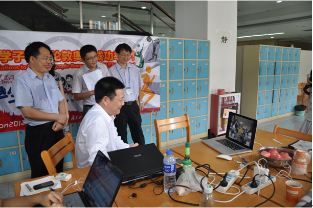 本网讯 7月27日下午,时逢伦敦奥运会开幕在即,校长仲伟合前往南校区图书馆看望我校“学生哥闯奥运”——伦敦奥运学生记者报道团后方团队,并通过网络视频亲切慰问了前方记者报道团的我校师生。校党委宣传部部长胡文涛、新闻学院党委书记孔晓明、图书馆副馆长杨成杰、新闻学院教师高红艳等陪同前往。