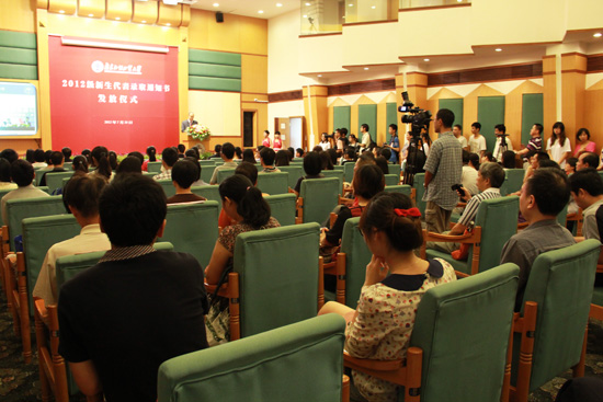 本网讯 十载寒窗赛高考,金榜题名在广外。高校通常是通过邮寄等方式将录取通知书送到考生手中,但广外却别开生面。7月20日下午,2012年高考录取通知书颁发仪式在广外北校区举行。56名2012级新生代表从校长仲伟合手中接过高考录取通知书,开启了他们的大学之门。