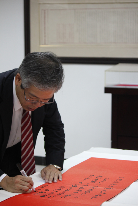 翻阅图书馆书刊,挥毫祝愿中日友好