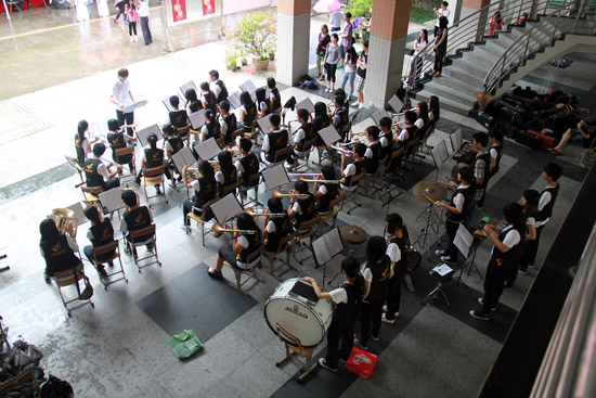 咨询会的又一大亮点是由校管乐在二教门口献上的管乐表演。在咨询会开始后,管乐团的同学整齐地陆续奏出校歌《凤鸣岭南》、《歌唱祖国》和《长江之歌》等作品。管乐团娴熟的配合,纯金属的表演带来了原汁原味的管乐表演,吸引了不少学生和家长驻足观看。