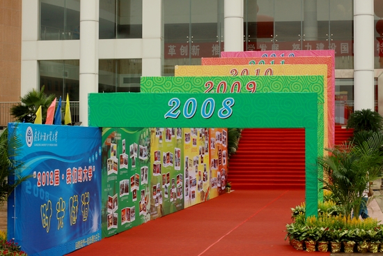 时光隧道:鲁迅书名道尽四年点滴生活 大会堂外,青绿黄红四色的拱门共同架构起迎接毕业生的“时光隧道”,带领莘莘学子回忆往昔,展望未来。拱门的侧面,学生处别出心裁的用鲁迅的作品名称概括了,大学四年的点点感悟。从大一的《故事新编》、大二的《呐喊》、大三的《彷徨》到大四的《朝花夕拾》,在“时光隧道”里回想四年,心中汹涌澎湃,有欢笑也有眼泪。