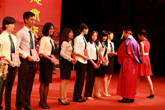继代表发言后,陈德萍宣读了《广东外语外贸大学优秀大学生奖章的决定》及《关于表彰2012年广东省优秀研究生的通报》,授予季一菲等16位毕业生“优秀大学生”奖章及陈明等23名学生广东省2012年度“优秀研究生”荣誉称号。随后经贸学院的相关学生上台接受表彰并与校长合影留念。
