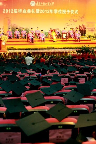 本网讯 “凤凰花开,毕业季来。”6月25日,我校2012届毕业典礼暨学位授予仪式在南校大会堂准时拉开帷幕。首场毕业典礼为经贸学院专场,随后还有为期四天共八场毕业典礼分别在南北校举行。校长仲伟合、副校长陈德萍、何传添以及经贸学院院长李铁立等均出席本次仪式。毕业典礼由卢景辉主持。