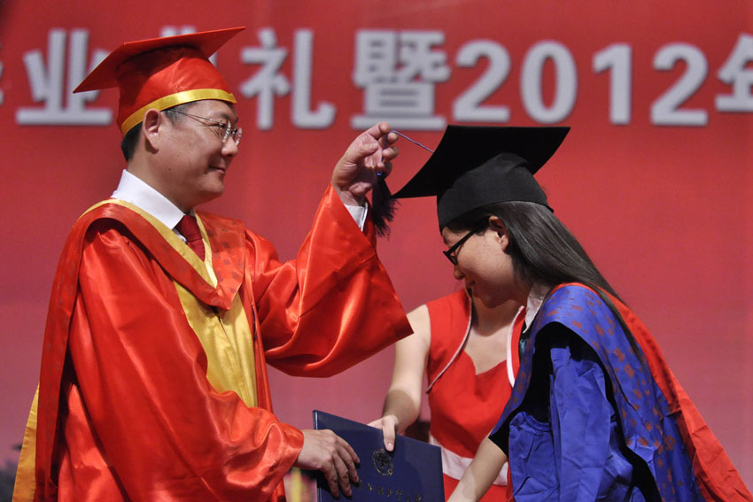 在将近两个小时的时间里,伴随着时而激昂时而轻快灵动的音乐,仲伟合始终脸带微笑,一一为毕业生拨穗并亲自颁发学位证书。一些毕业生在接过证书后更是“各出奇招”为这一幕留下深刻纪念。有的手握拳头放在嘴边装出“卖萌”状;有的拿出手机与校长一起手捧证书“自拍”;有的同学则激动地抱住校长。而仲伟合在颁发当场最后一本证书时,更是翻开证书,与学生手握证书,肩并肩拍照,引来全场欢呼。每一本证书都象征着毕业生已学有所成,能够扬帆远航。