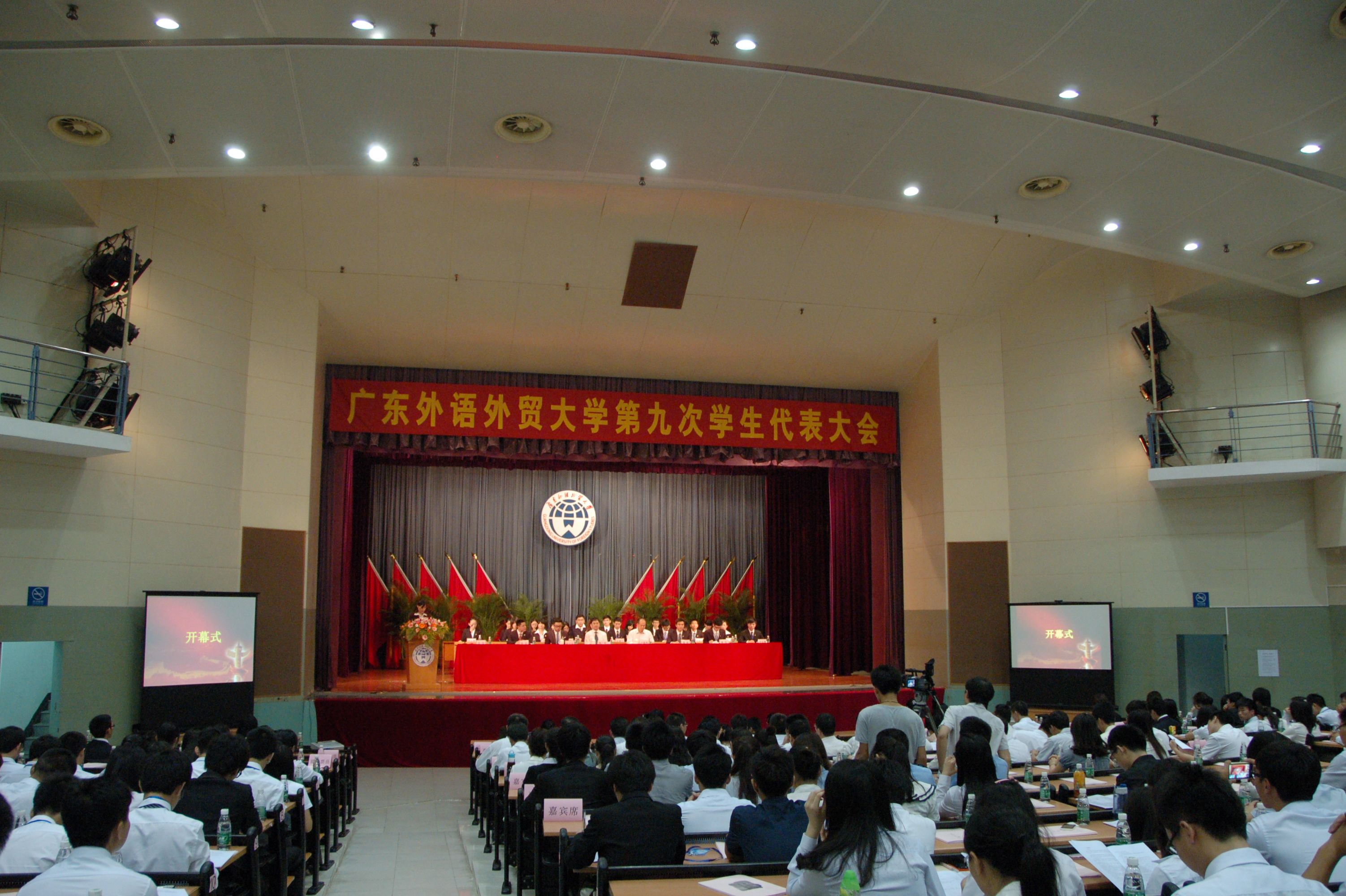 本网讯 6月10日,我校第九次学生代表大会在南校B8学术报告厅举行,大会审议通过了我校学生会第八届委员会工作报告;“我与学校共成长”提案征集工作报告,修改、审议和通过《广东外语外贸大学学生会章程(修正案)》,选举产生了学生会第九届委员会委员。