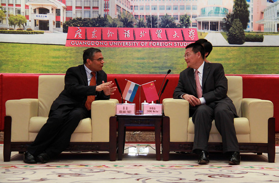 仲伟合首先代表我校向潘迪一行的再次来访表示欢迎,他表示我校今年将新增设印地语专业,并将于9月份招收第一批共20名学生。印度驻穗总领馆一直以来密切关注我校并给与我校诸多帮助,并承诺在五年之内将一直支持和帮助派遣外籍教师。
