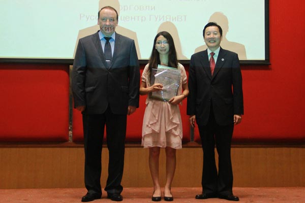俄罗斯驻广州总领事馆文化随员安娜•德米特里耶夫娜宣布了“契柯夫征文比赛”的获奖名单。米哈伊尔·维克多洛维奇·梅德韦杰夫和方凡泉为获奖选手颁奖。我校俄语系学子张晓纯夺得此次比赛的特等奖,她同时也获得了俄罗斯参观游览的机会。